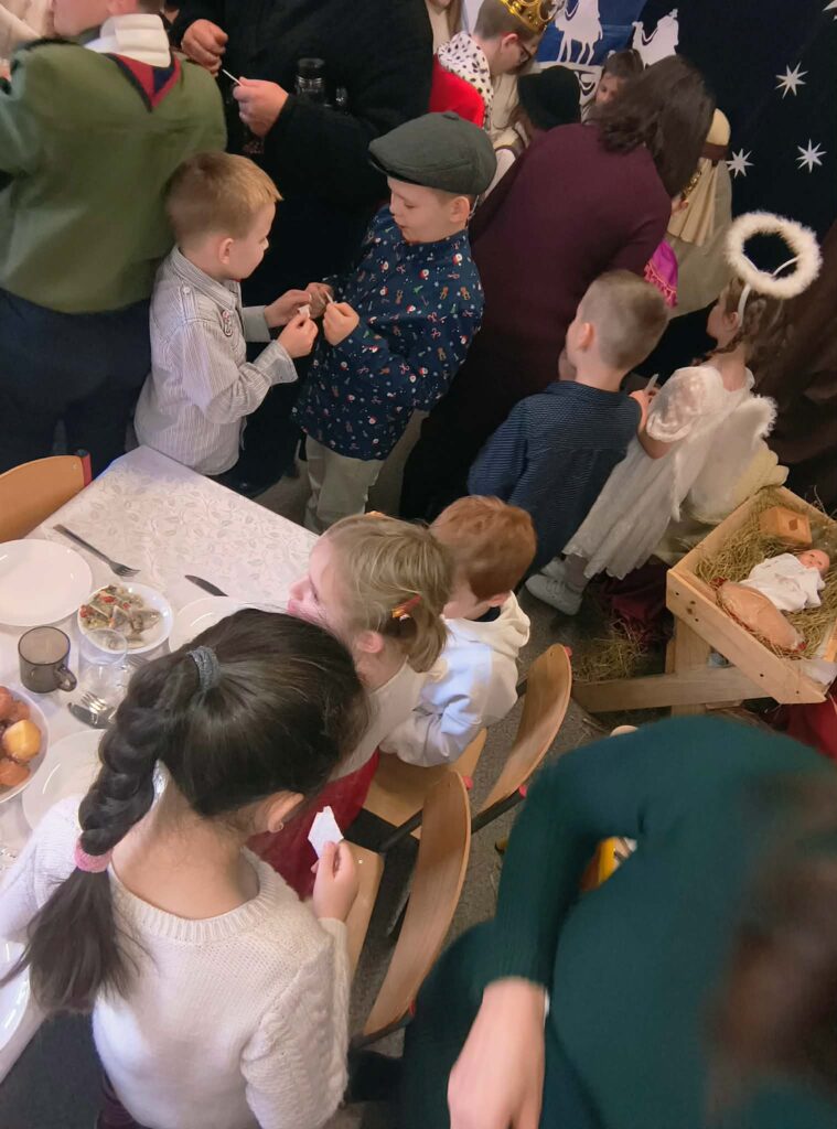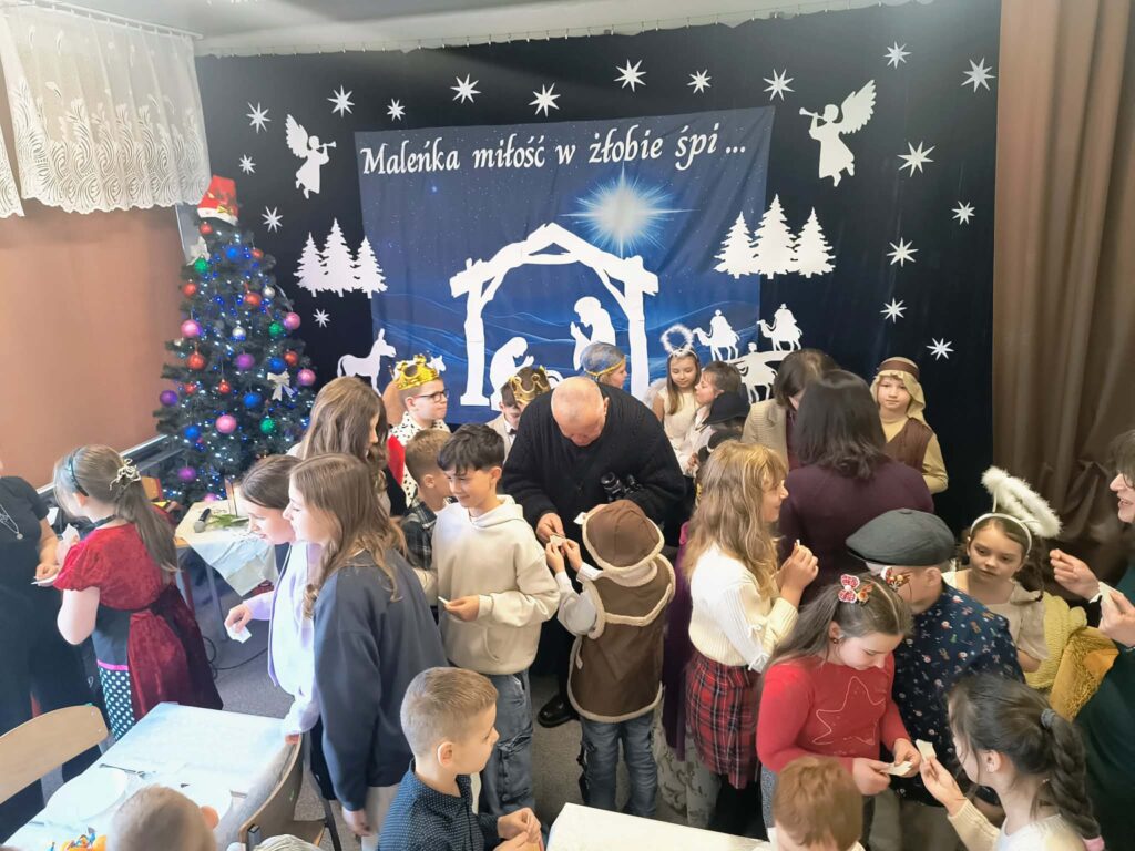 Po części artystycznej nadszedł czas na wspólne życzenia oraz Wigilię szkolną, która odbyła się na dolnym korytarzu. Był to moment pełen radości, rozmów i dzielenia się opłatkiem.