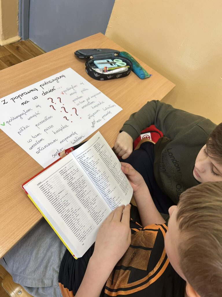 i odgadywali hasła związane powiedzeniami polskimi. Powstała również gazetka nt. naszego języka ojczystego. Klasa 6 przy pomocy Słowników Języka Polskiego sprawdzała pisownię wyrazów na przygotowanych plakatach.