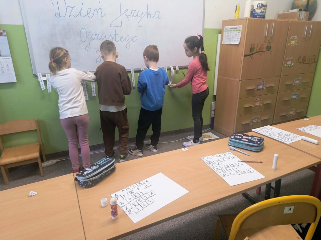 23 lutego przeprowadziliśmy szereg działań wspólnie z uczniami, które miały na celu uświadomić nam wartość naszego języka ojczystego. Uczniowie dowiedzieli się między innymi o tym ilu jest użytkowników języka polskiego na całym świecie, o wyjątkowości naszego alfabetu czy, jak brzmiało pierwsze zdanie w języku ojczystym. W naszej szkole podczas lekcji uczniowie klasy 1-ej układali wyrazy z literek i objaśniali ich znaczenie. Ponadto uczniowie w tym dniu rozwiązywali zadania dotyczące poprawnej pisowni, odnajdowania synonimów, wykreślania archaizmów, wyszukiwania związków frazeologicznych i łączenia wyrazów z ich znaczeniem. Klasa 3 podjęła wyzwanie i wszyscy czytali swoje wybrane łamańce językowe, co dostarczyło dużo śmiechu i zabawy. Uczniowie klasy 8 wzięli udział w zabawie kalambury