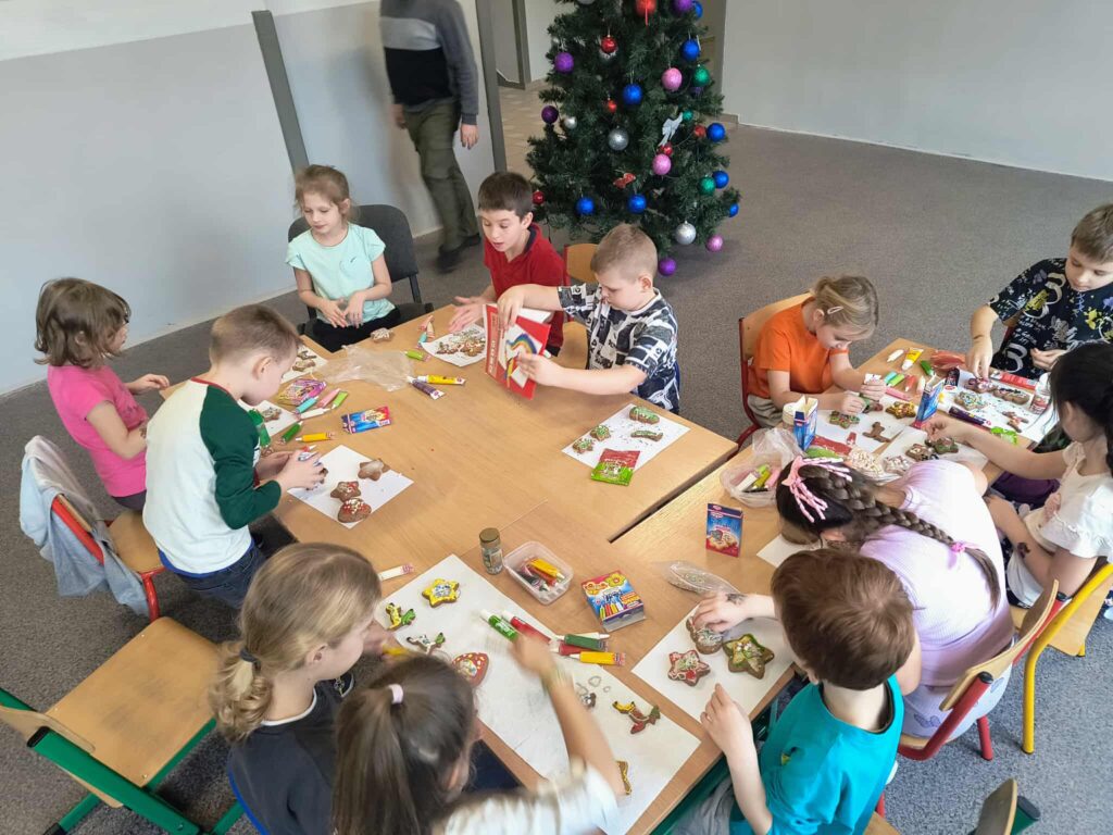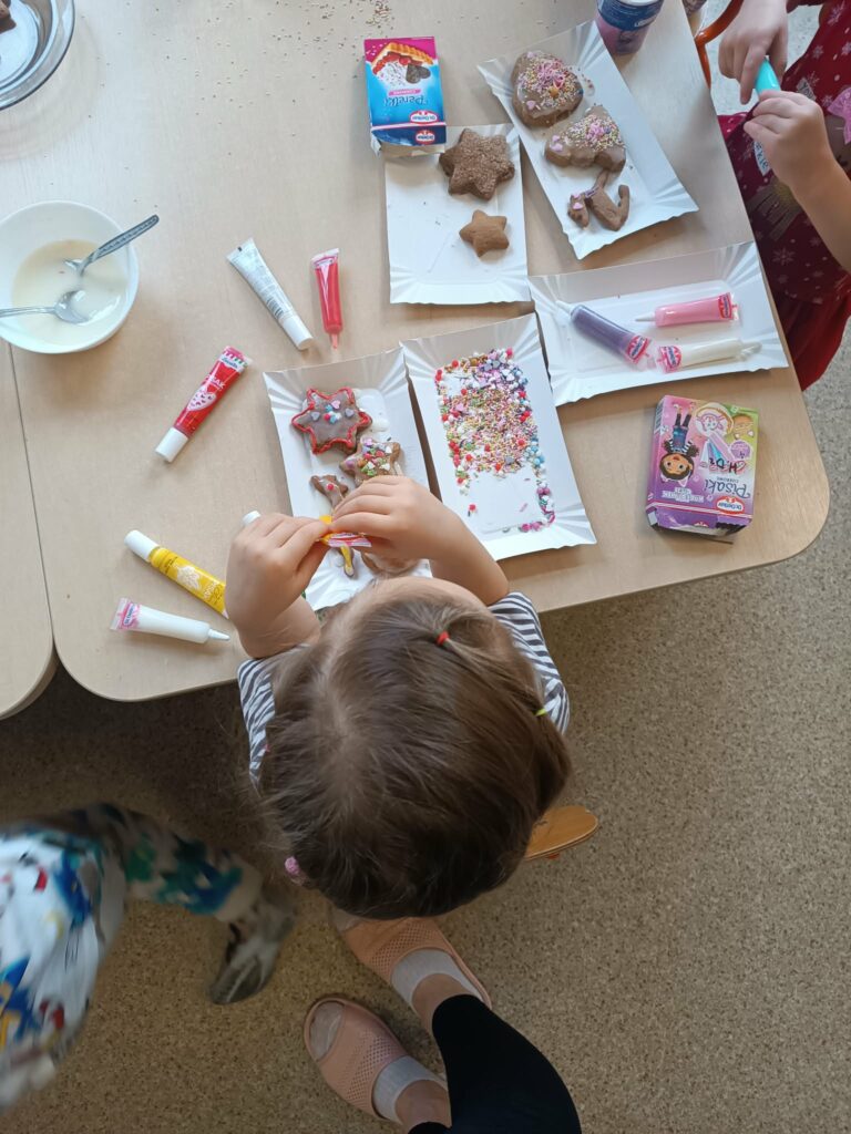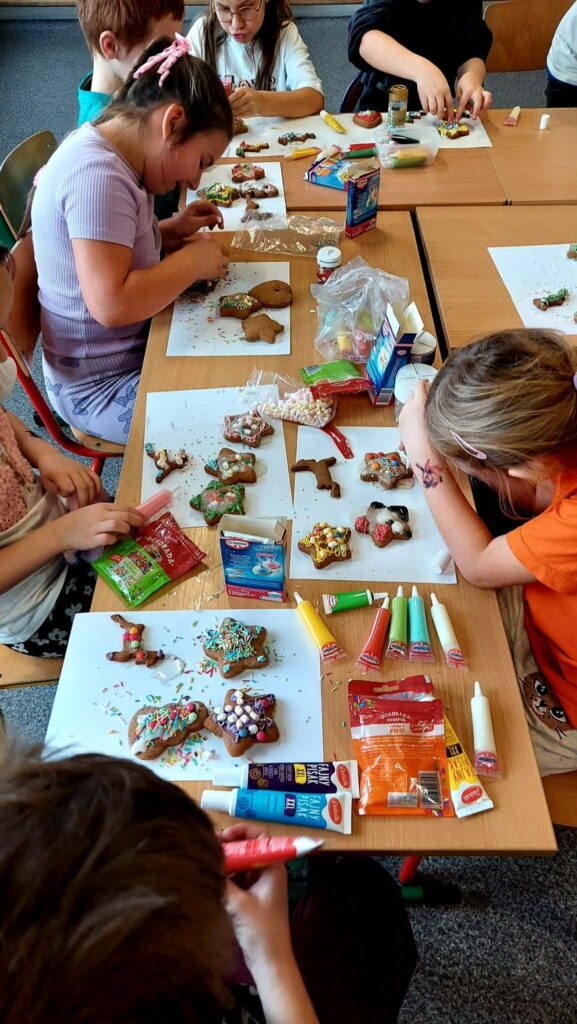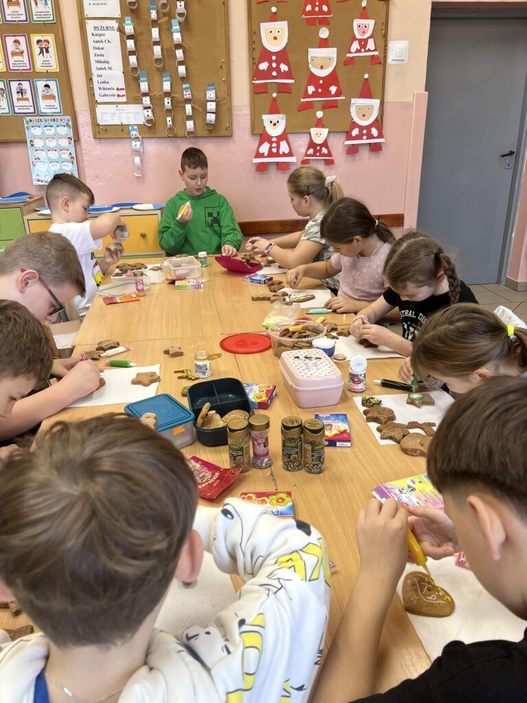 Święta bez pierniczków to Święta stracone! Kierując się tym przesłaniem uczniowie klas 1-3 oraz przedszkolaki z naszej szkoły postanowili zadośćuczynić tej tradycji. W związku z tym, dzieci zabrały się do dekorowania pierników. Wszyscy pracowali z ogromnym zapałem i zaangażowaniem, tworząc prawdziwe cudeńka. Podczas pracy było wiele radości i śmiechu. Po takim sprawdzianie umiejętności zdobienia pierniczków w domu pójdzie „jak po maśle”. Powstały prawdziwe dzieła „piernikowe”. Każdy mógł się wykazać zdolnościami artystycznymi i fantazją przy dekorowaniu smakołyków. Lukier, polewa czekoladowa i kolorowa posypka nadały naszym ciasteczkom ciekawy i zachęcający do skosztowania wygląd.